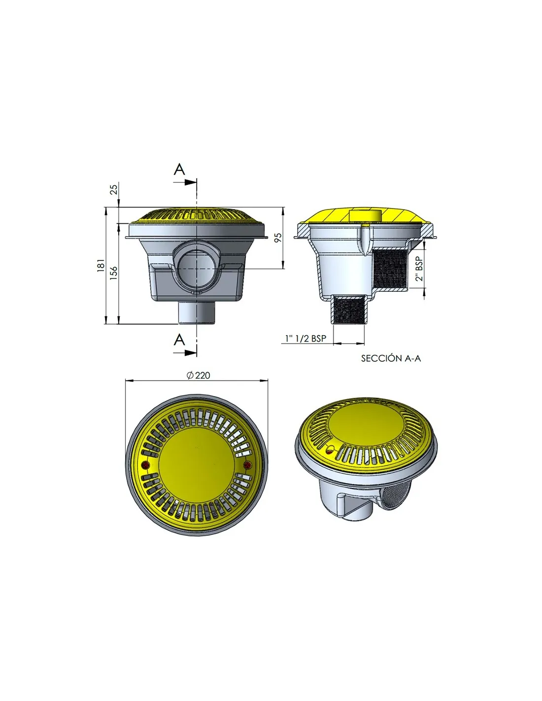 Tots els embornals de la gamma en plàstic se subministren amb tractament UV a la reixeta. · Segons Norma UNE 13451-1, en piscines col·lectives, cal: - Velocitat de pas de 0,5 m/seg - Velocitat màx d'aspiració en canonada de 1,5 m/seg - Distància mínima entre embornals: >2 m · Recomanem: Ús de l'equip de seguretat WARNER per a detecció de buit i aturada automàtica de bombes Fabricats en material ABS blanc. Sortida lateral de 2" i sortida inferior de 11/2". Tapada amb un semitroquelat, la qual cosa permet que es pugui obrir segons necessitat. Cabal màx: 13 m3/h