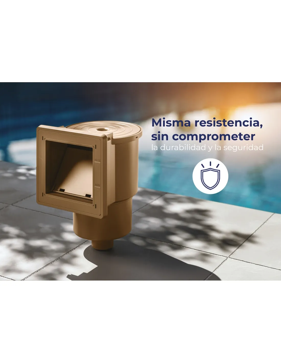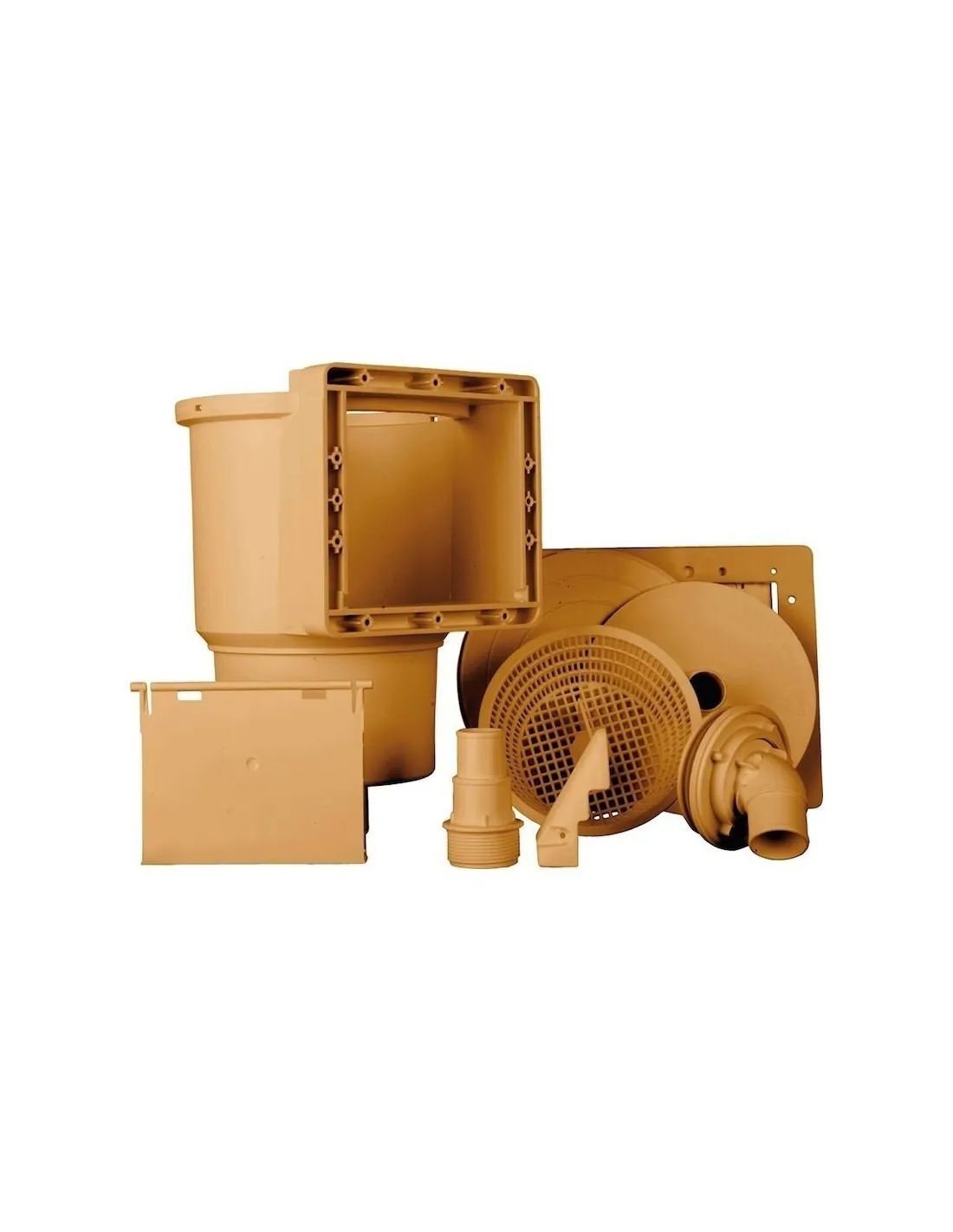 Der Skimmer wird mit der Korbklappe und der runden oberen Abdeckung, dem Rahmen mit dem Zierrahmen, der doppelten Dichtung, der Auslaufdüse, der Abdeckung für den Anschluss des Beckenreinigers und den passenden Anschlüssen für 32- und 38-mm-Schläuche geliefert