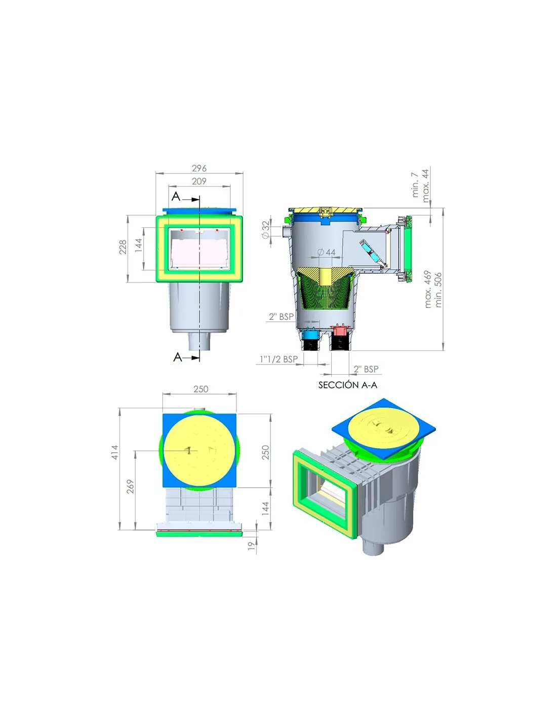 Gleichzeitiger Anschluss an den Sumpf: 1½" Innengewinde und 2" Außengewinde