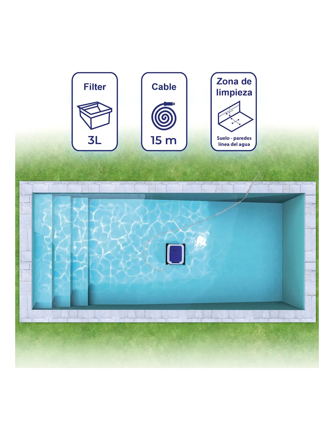 1 cleaning cycle: floor/walls/waterline in 2h - for pools up to 9x4m
