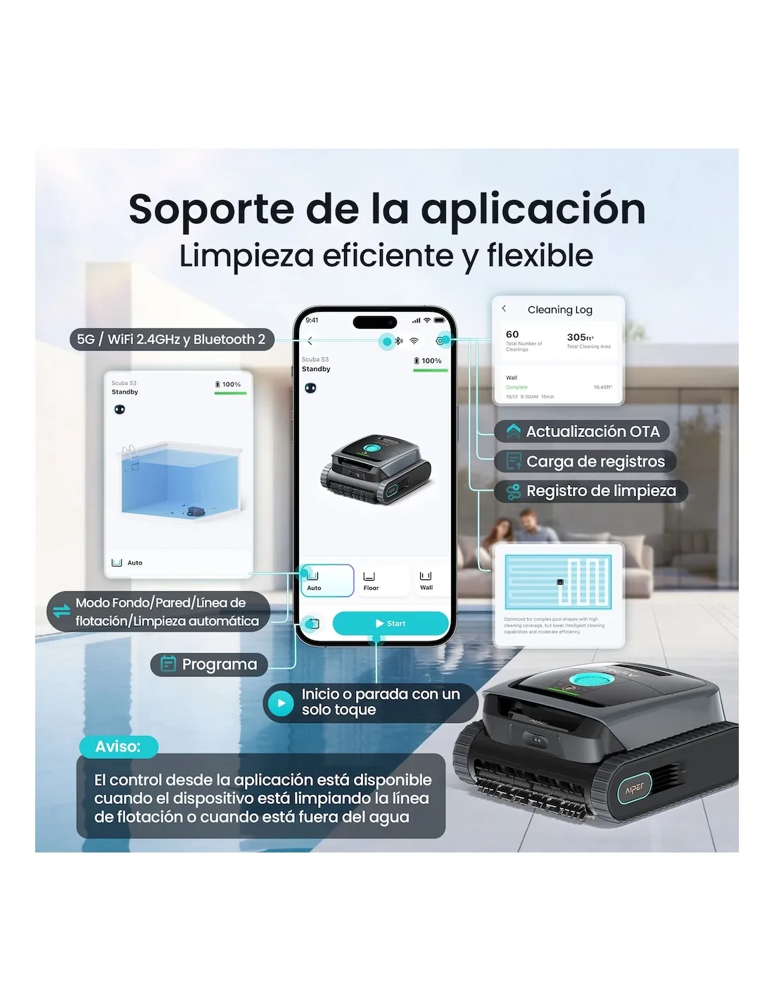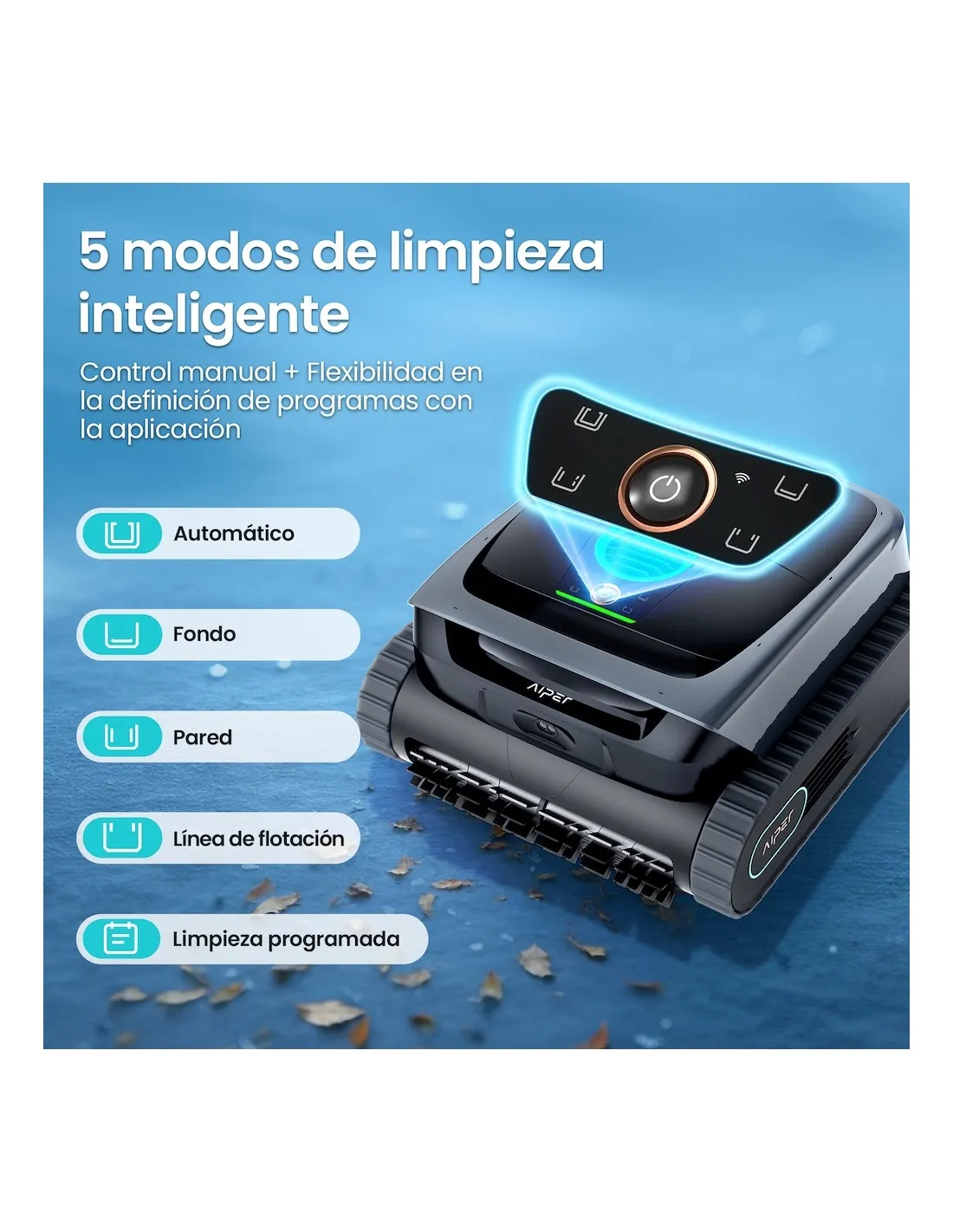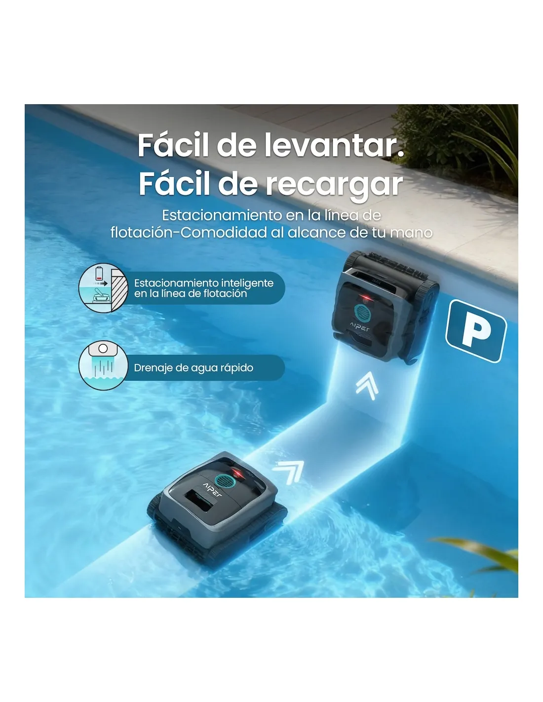 Aiper is an innovative brand specialized in technology for pool maintenance. At Piscinarium we are an official Aiper store, which allows us to offer you the best advice, 100% original products and official guarantee. The Aiper pool cleaners catalog stands out for its autonomy, efficiency and ease of use, especially in wireless models, designed for individuals looking for professional results without complications.
