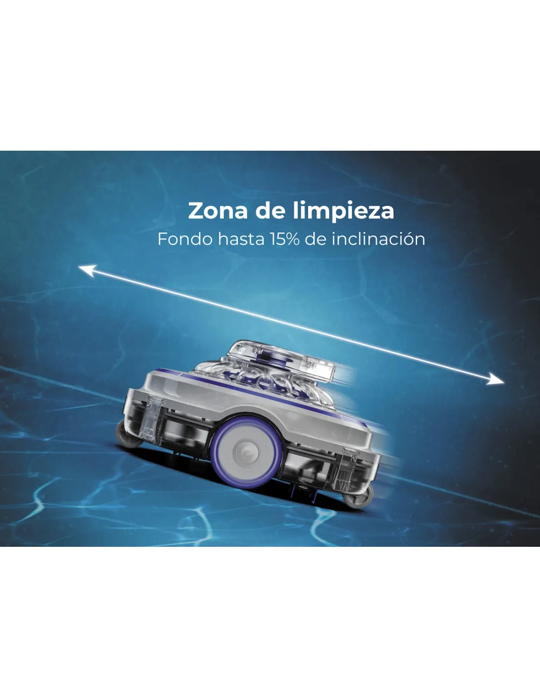 - Battery-powered robot for above-ground and in-ground pools (max. 15% inclination)