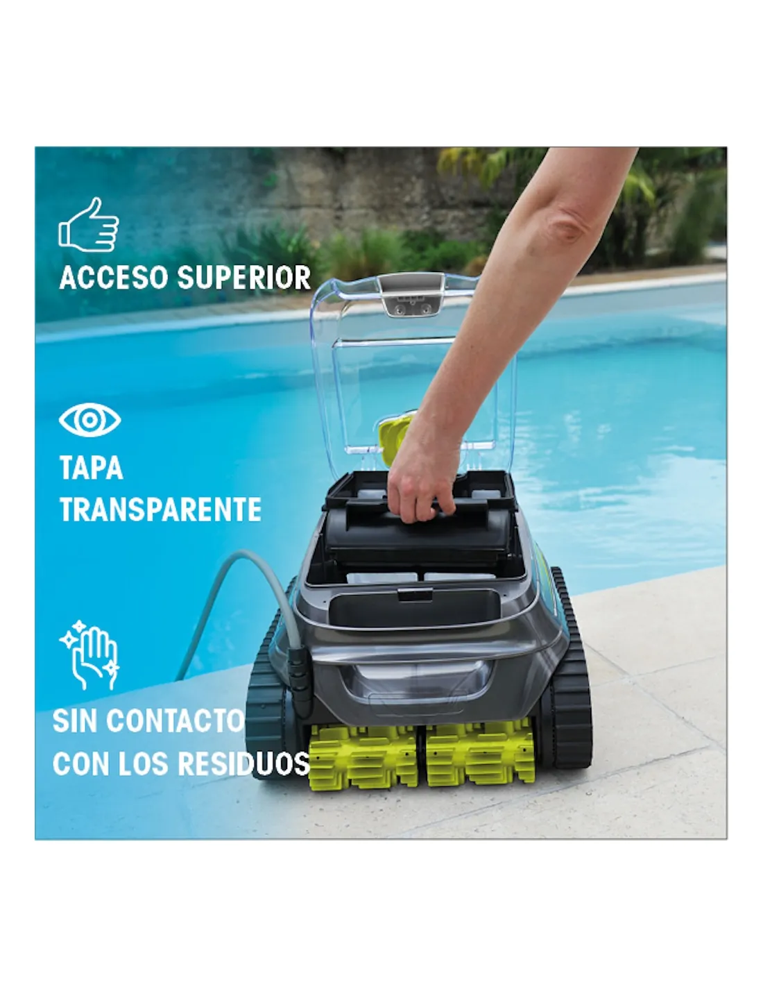 Its filter, accessible from the top, allows for real convenience in daily use. The quick water discharge makes it easy to remove the robot from the pool.