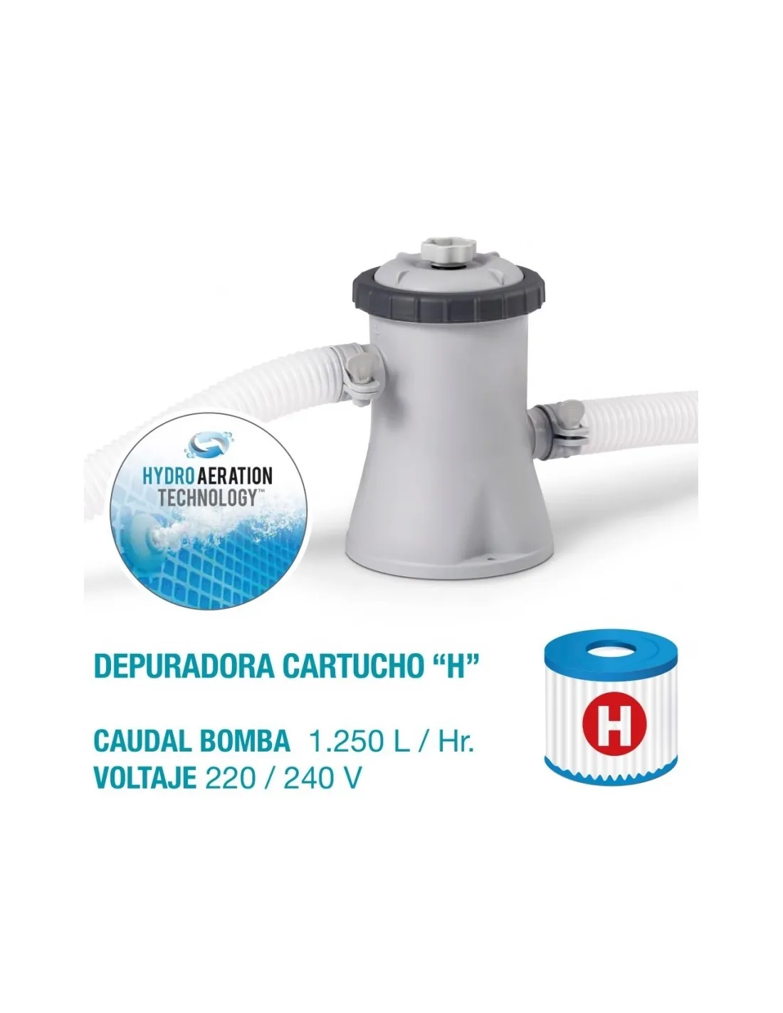 Includes a 1,250 l/h cartridge filter with H-type filters, Ø 32 mm connections and Hydro Aeration Technology system that improves filtration and increases water purity.