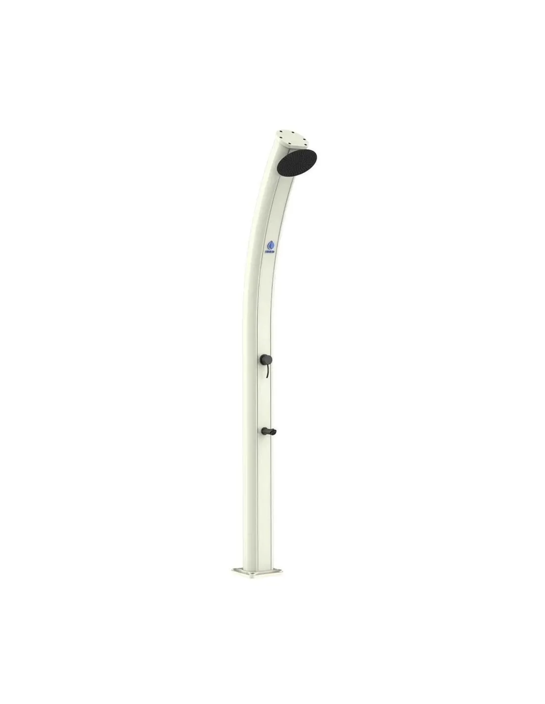 Ecological solar shower DAFNE white with 20 cm round shower head, mixer and footbath tap Shower with curved aluminum structure for outdoor use. Tank 35 liters, 226 cm high. Suitable for swimming pool, garden, BeB, hotels, campsites.
