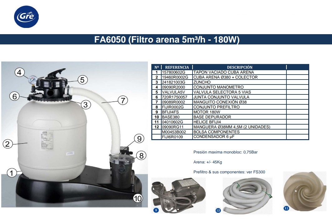 Recambios Gre para equipos de filtración, filtro arena (Referencia: FA6050). Recambios originales GRE.