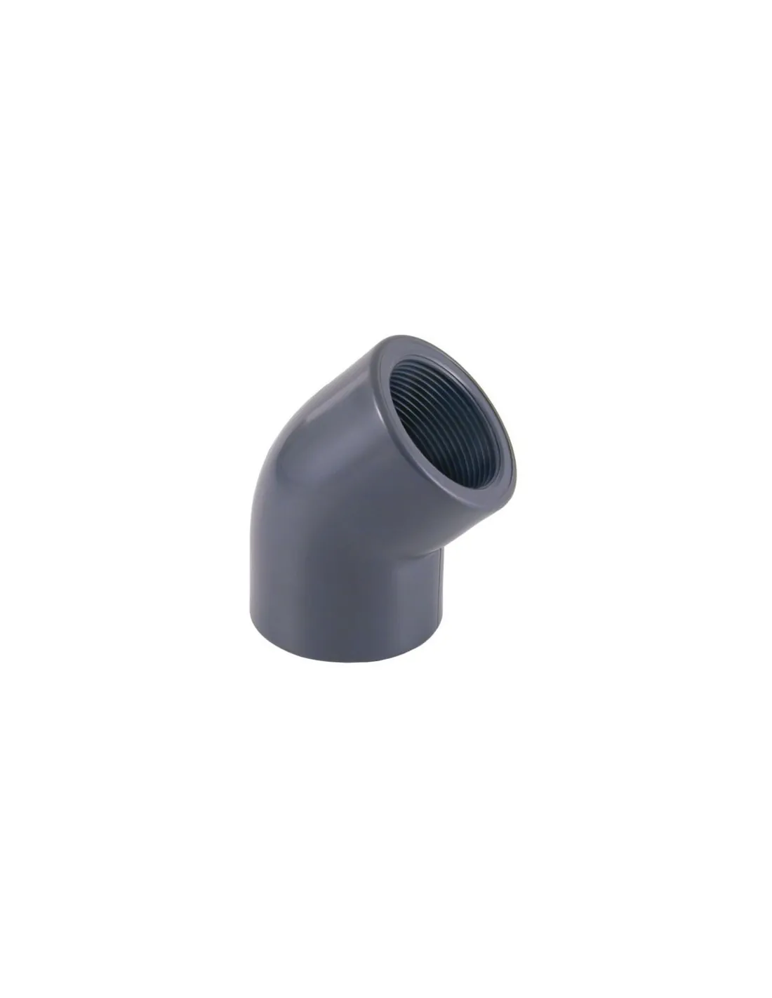 Permite realizar cambios de dirección de las tuberías de PVC en ángulos de 45º, encolando por un lado y roscando por el otro (rosca hembra).