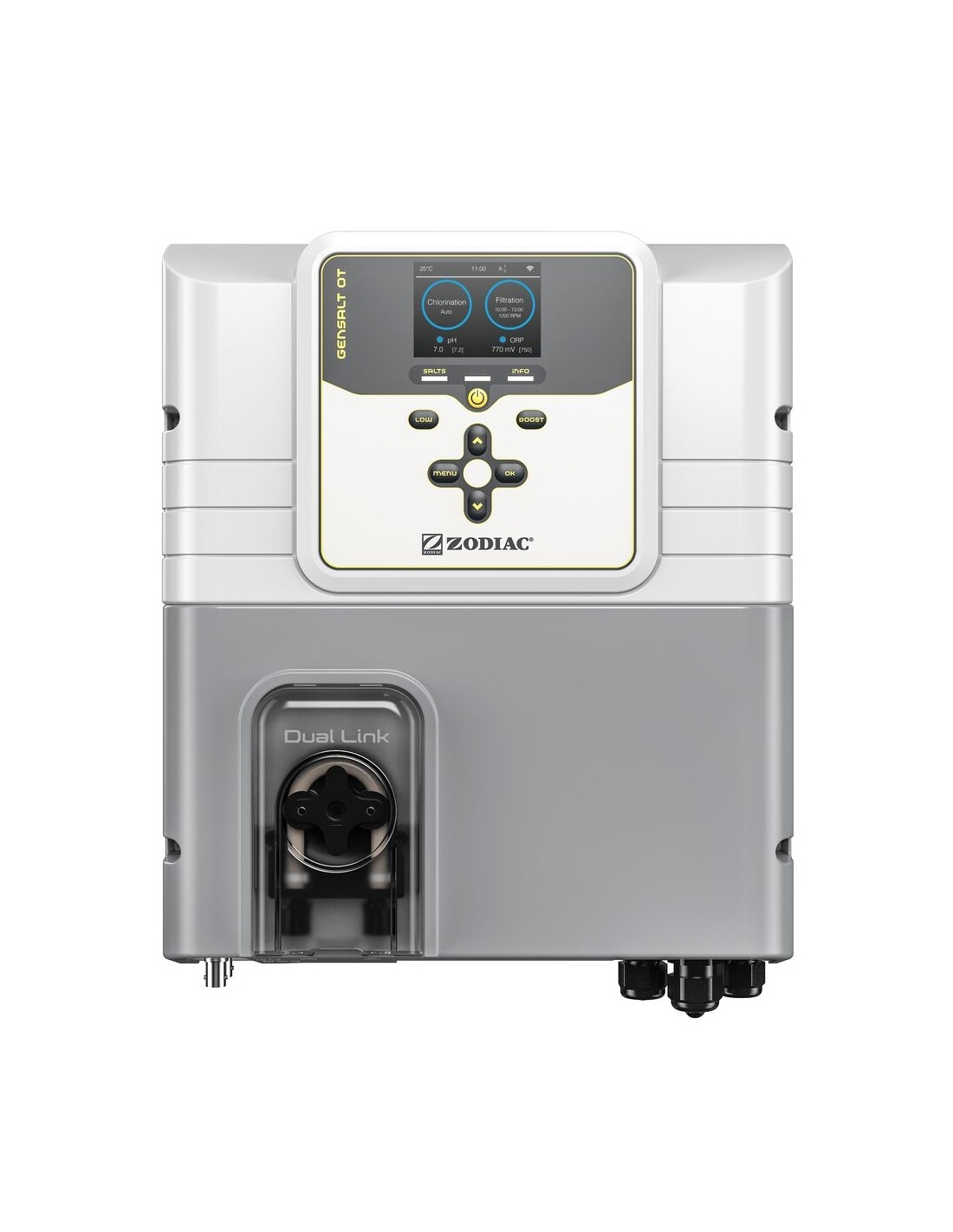 Clorador salino Zodiac GenSalt OT con control del equipo de la piscina.
