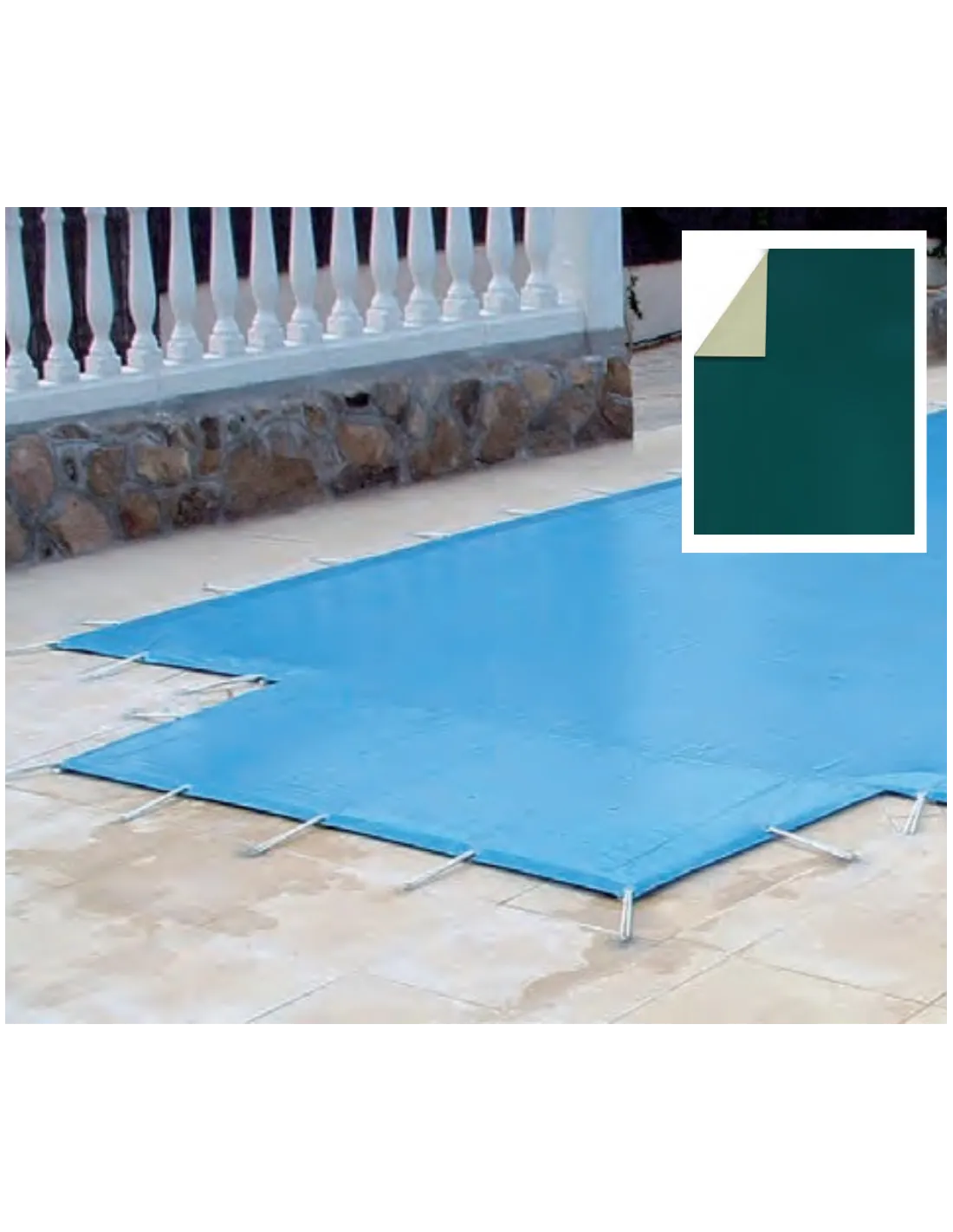 Cobertor de invierno para piscina realizado en poliéster reforzado en PVC con tratamiento anti-UVA.