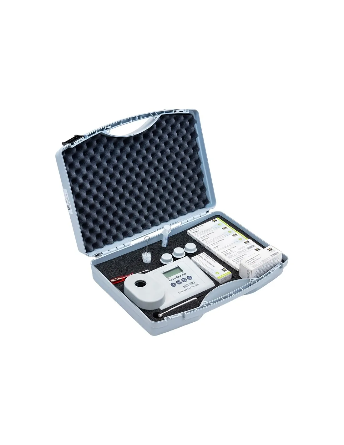El maletín incluye: pilas (AA), cubetas con tapa, anillos de obturación, varilla agitadora, cepillo, jeringuilla de dosificación (5ml), tabletas de reactivo, instrucciones de operación, manual del Método y certificados