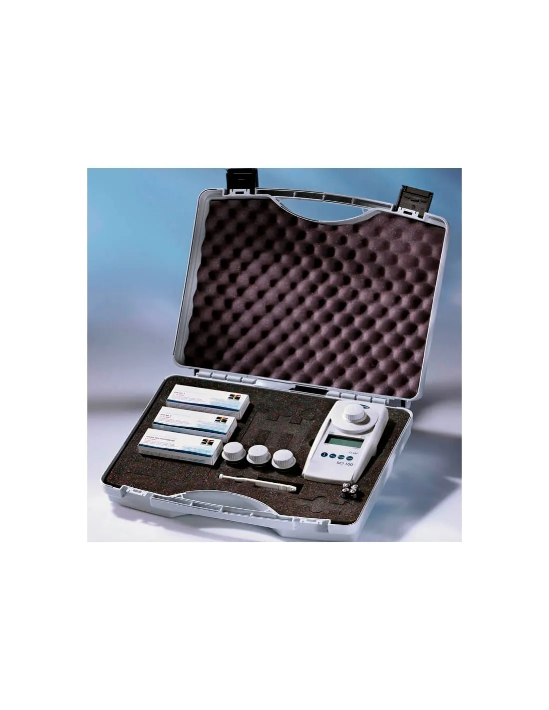El maletín incluye: pilas (AA), cubetas con tapa, anillos de obturación, varilla agitadora, cepillo, tabletas de reactivo, instrucciones de operación, y certificado (COC)