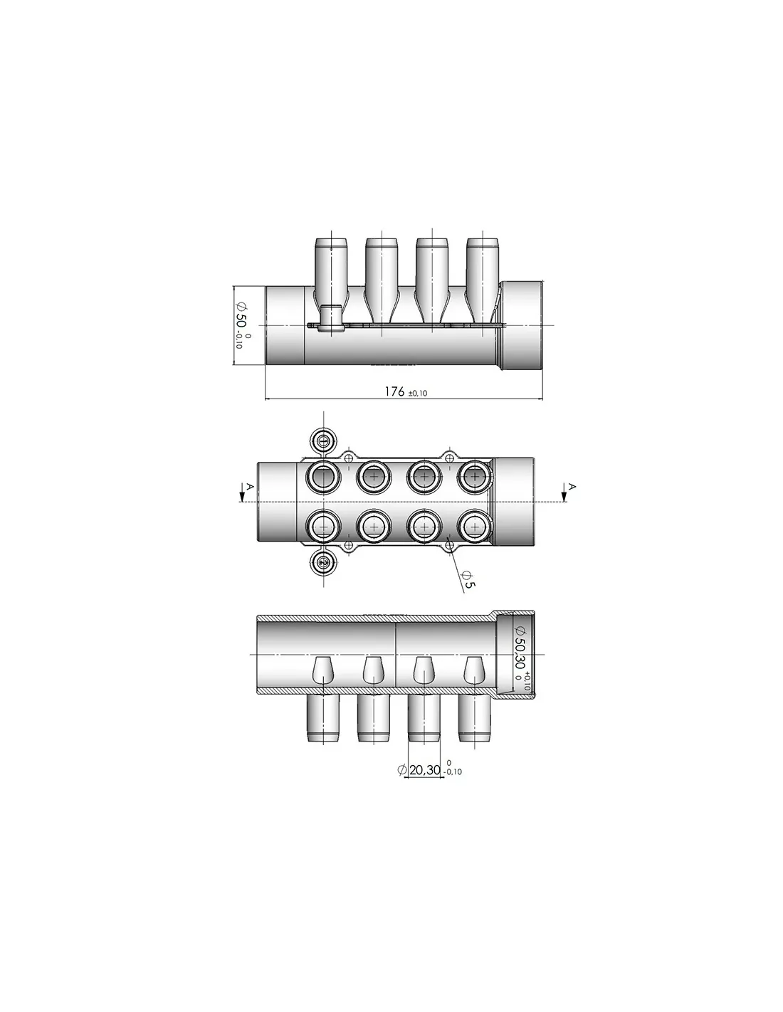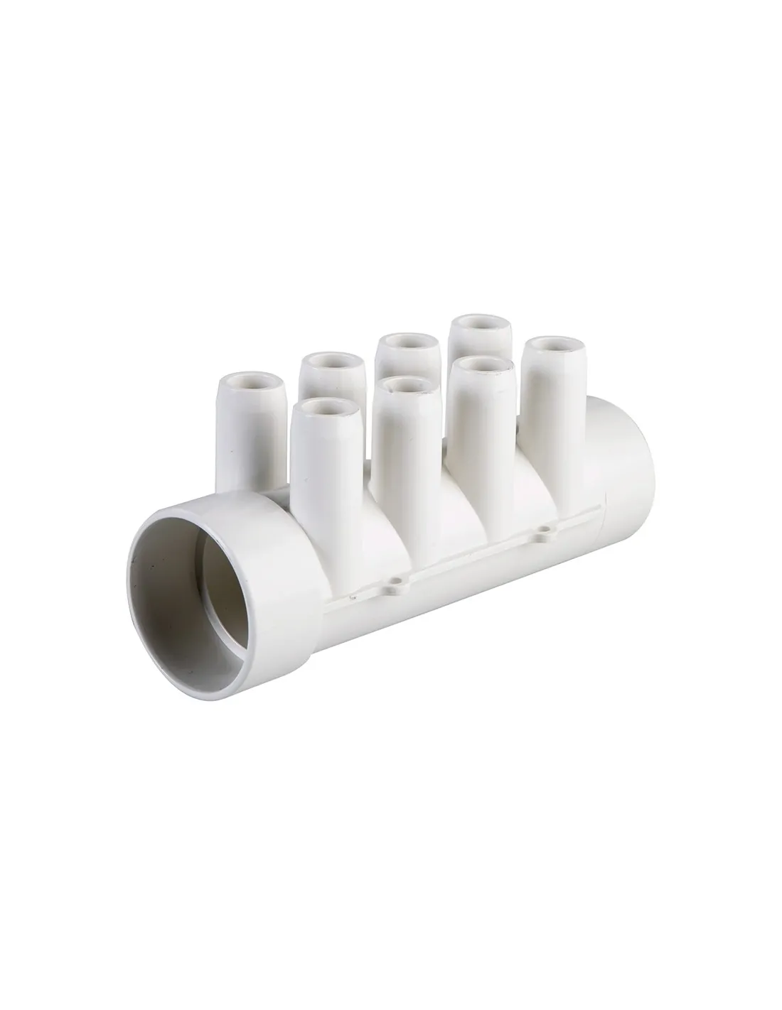 Collettore d'acqua AstralPool da incollare a un tubo da 50 mm con 8 uscite da flangiare a un tubo di 20 mm di diametro interno.