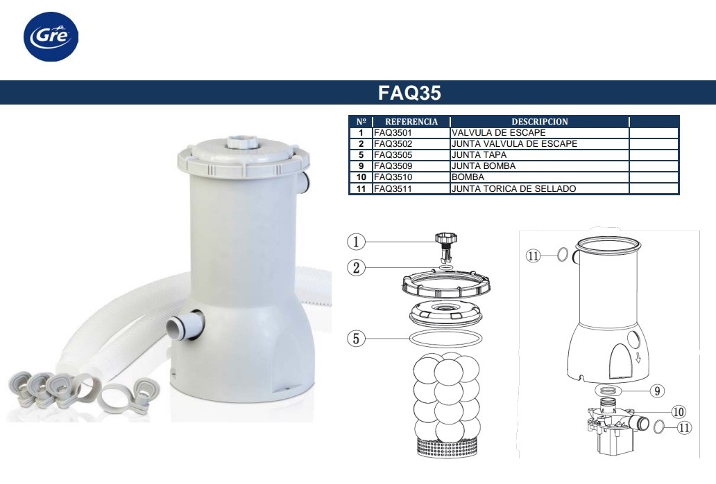 Onderdelen Gre voor filtratieapparatuur, zandfilter (referentie: FAQ35). Originele GRE-reserveonderdelen.