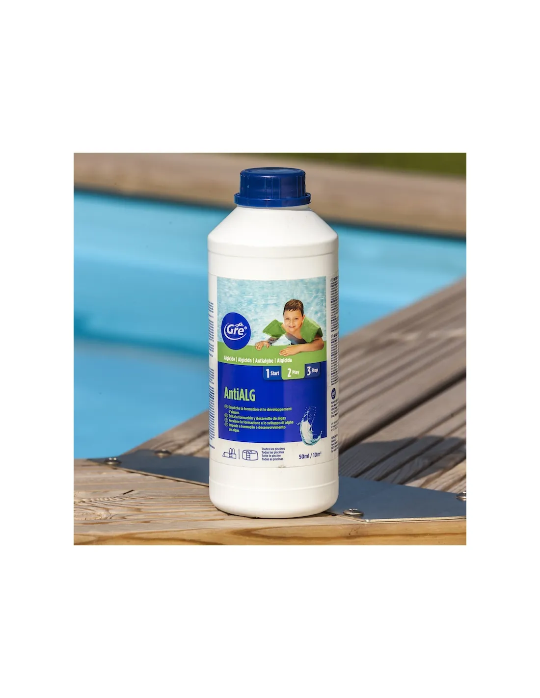 Anti-algenbehandeling van het merk Gre voor het onderhoud van zwembadwater.