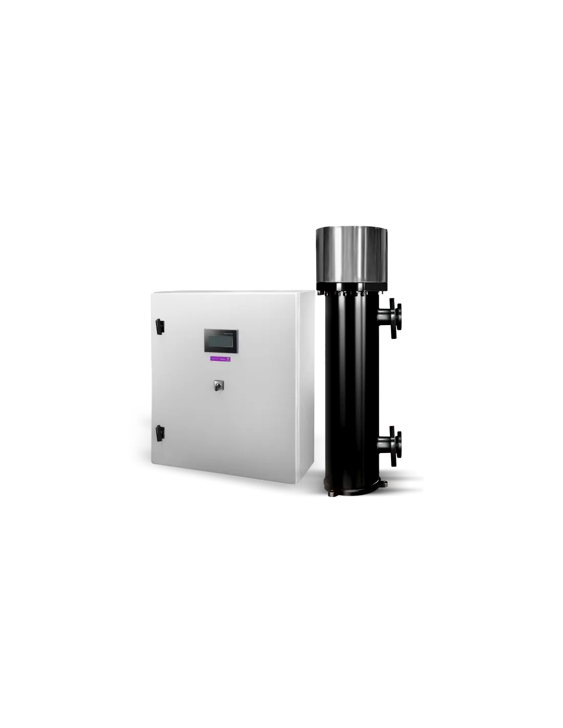 UV-behandelingssystemen Idegis Sirius LP PE met HO lagedruk (LP) lampen voor commerciële en aquacultuur zwembadtoepassingen met debieten tot 95 kubieke meter per uur, waarbij doses van 30 mJ/cm2 worden toegepast.