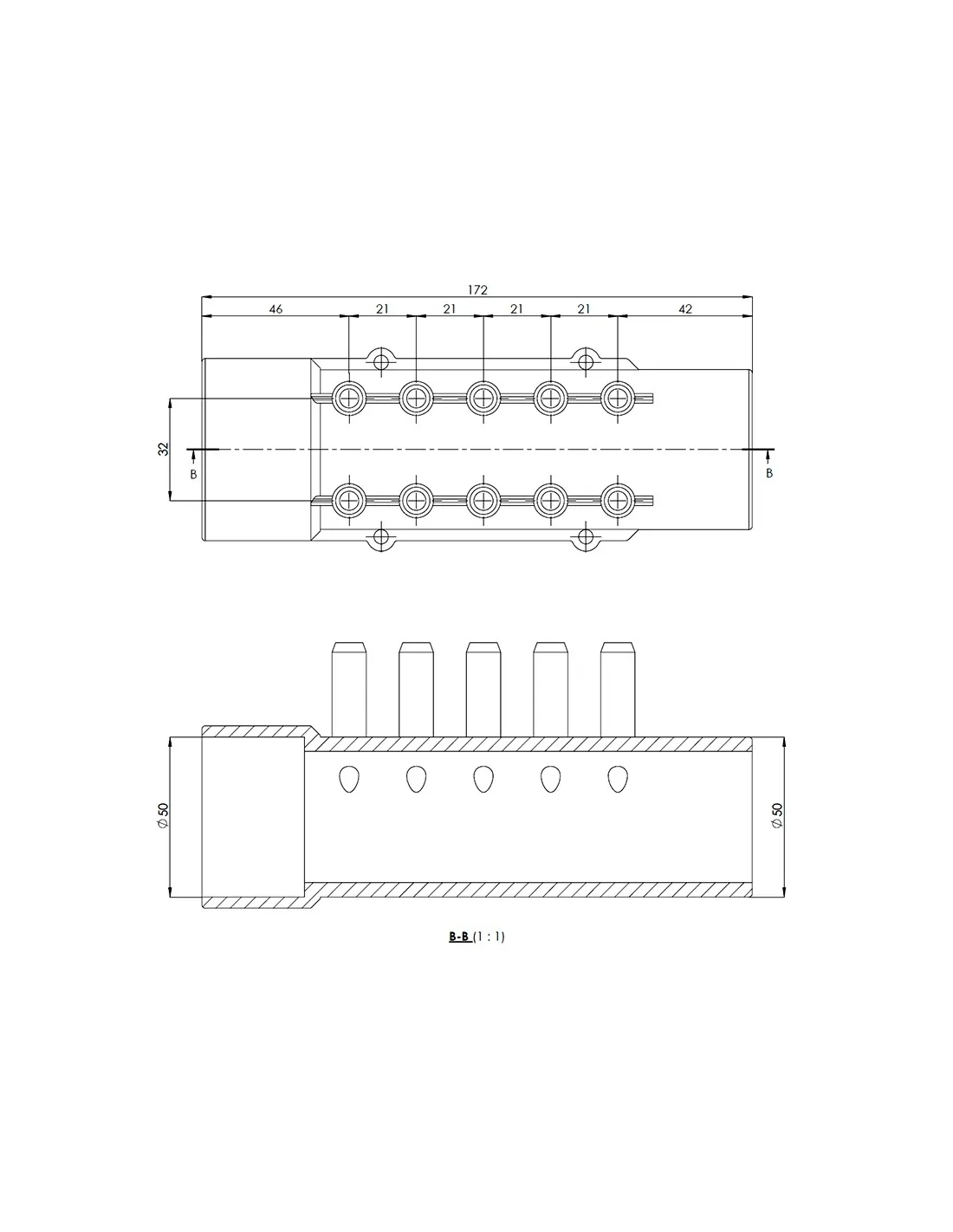 Distribuidor de ar com 10 saídas para ser flangeado a um tubo de 10 mm de diâmetro interior e colado a um tubo de 50 mm.