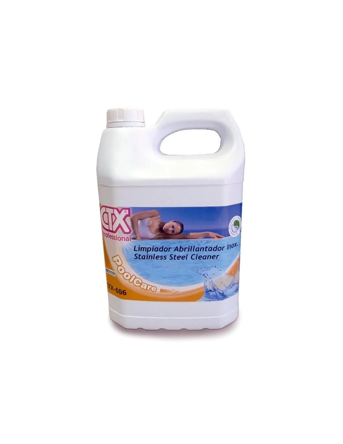 Produto para a limpeza e manutenção dos elementos de aço inoxidável presentes nas piscinas: escadas de acesso, chuveiros, canhões e cascatas, corrimões, etc.